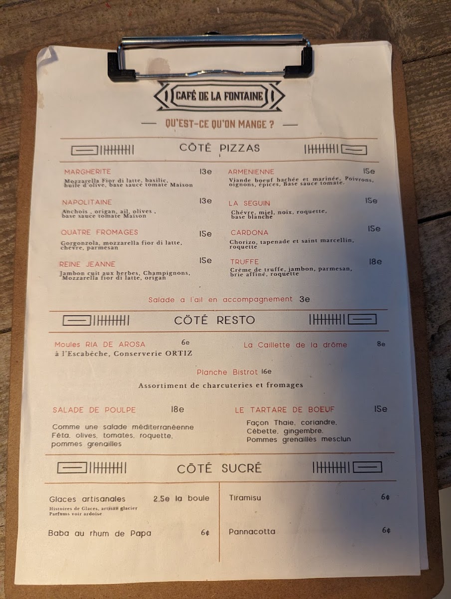 The menu at Le Cafe De La Fontaine presents a well-balanced snapshot of Provençal comfort and casual French dining, where simplicity is elevated by quality ingredients and thoughtful execution. Everyday pleasures like Café are treated with care, setting a relaxed tone that carries through the entire menu. On the savory side, dishes such as Calzone and Salade Gourmande deliver hearty satisfaction, appealing to diners looking for familiar flavors done right. Seafood lovers are well served by Tartare de Saumon, which stands out for its freshness and clean, precise taste, reinforcing the kitchen’s respect for raw ingredients.